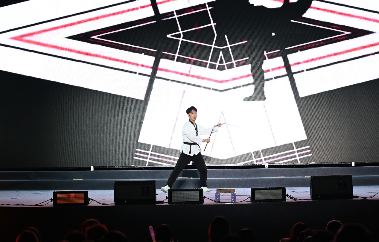 第一篇章“拾光筑梦·初见成贤”以“相遇”为核,用艺术勾勒初见的美好。歌曲串烧《爱就一个字》《她来听我的演唱会》用温柔旋律传递真挚情感,现代舞串烧《Psychic》《16 Shots》以强劲节奏展现青春张力;器乐合奏《知否知否》婉转悠扬,让古典韵味萦绕夜空,《社团秀》则以多元形式呈现校园文化的鲜活魅力;拉丁舞《马战之王》融合优雅与力量,情景剧朗诵《永不消逝的电波》更以深沉的家国情怀叩击人心,让新生在艺术熏陶中初识成贤精神。