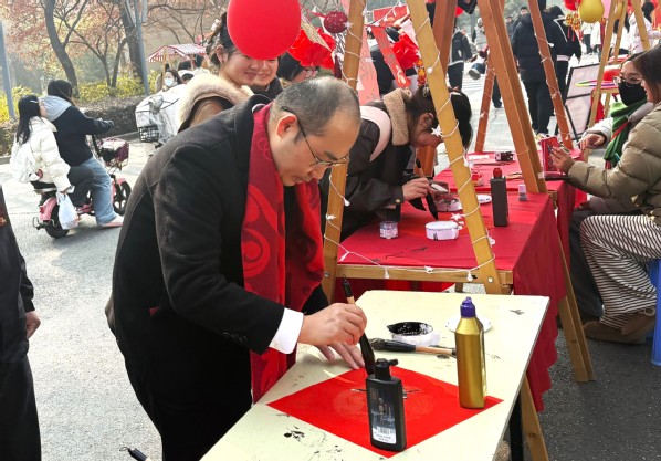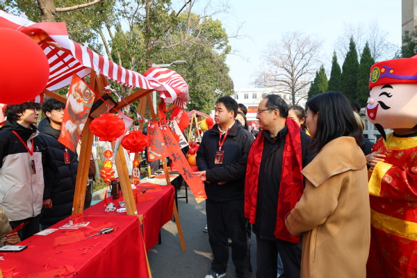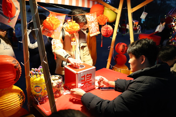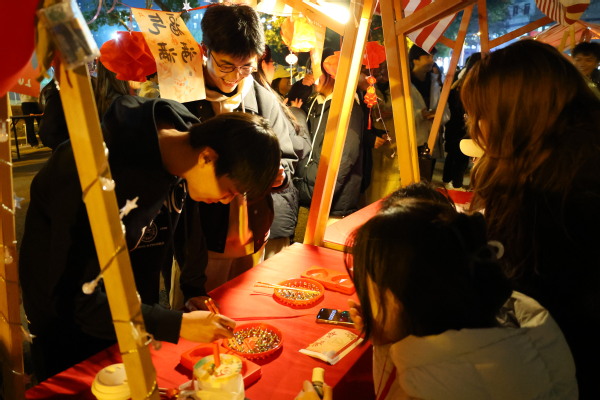 活动在气势恢宏的舞龙表演中拉开帷幕。金黄巨龙翻腾起舞、穿梭游弋,矫健的身姿与师生们蓬勃的朝气交相辉映,瞬间点燃全场热情,引来阵阵欢呼与喝彩。本次系列活动精准契合考试周学生的放松需求,精心设置了多元体验区域,让师生在沉浸参与中释放压力、感受温暖。文化体验区内,“墨启新元”摊位上笔墨飘香,师生们纷纷提笔挥毫,书写“福”字与春联,在一笔一画间体味传统书法韵味,传递文化自信;“新岁灯谜”区域人头攒动,大家或驻足凝思,或互相探讨,于趣味互动中领略传统文字智慧。趣味游戏区更是热闹非凡,成为解压放松的核心阵地。“海底捞珠”“你划我猜”等互动项目让同学们在协作比拼中开怀欢笑;“滚铁圈”“跳房子”“丢沙包”等经典怀旧游戏,既唤醒了老师们的童年记忆,也让学子们在亲身体验中感受传统游戏的魅力,于奔跑跳跃间舒展身心、释放压力。美食摊位前香气缭绕,各式特色小吃琳琅满目,热气腾腾的食物不仅驱散了冬日的寒意,也为备考学子补充了能量。夜幕降临后,学生手作创意摊位灯火璀璨,精美的手工作品凝聚着学子们的智慧与巧思,不仅展现出蓬勃的创造力,更让大家在欣赏交流中感受到青春的温度与活力。活动在温馨、热烈、欢愉的氛围中圆满落幕。师生们带着满满的活力与温暖,携手迈向充满希望的2026年。